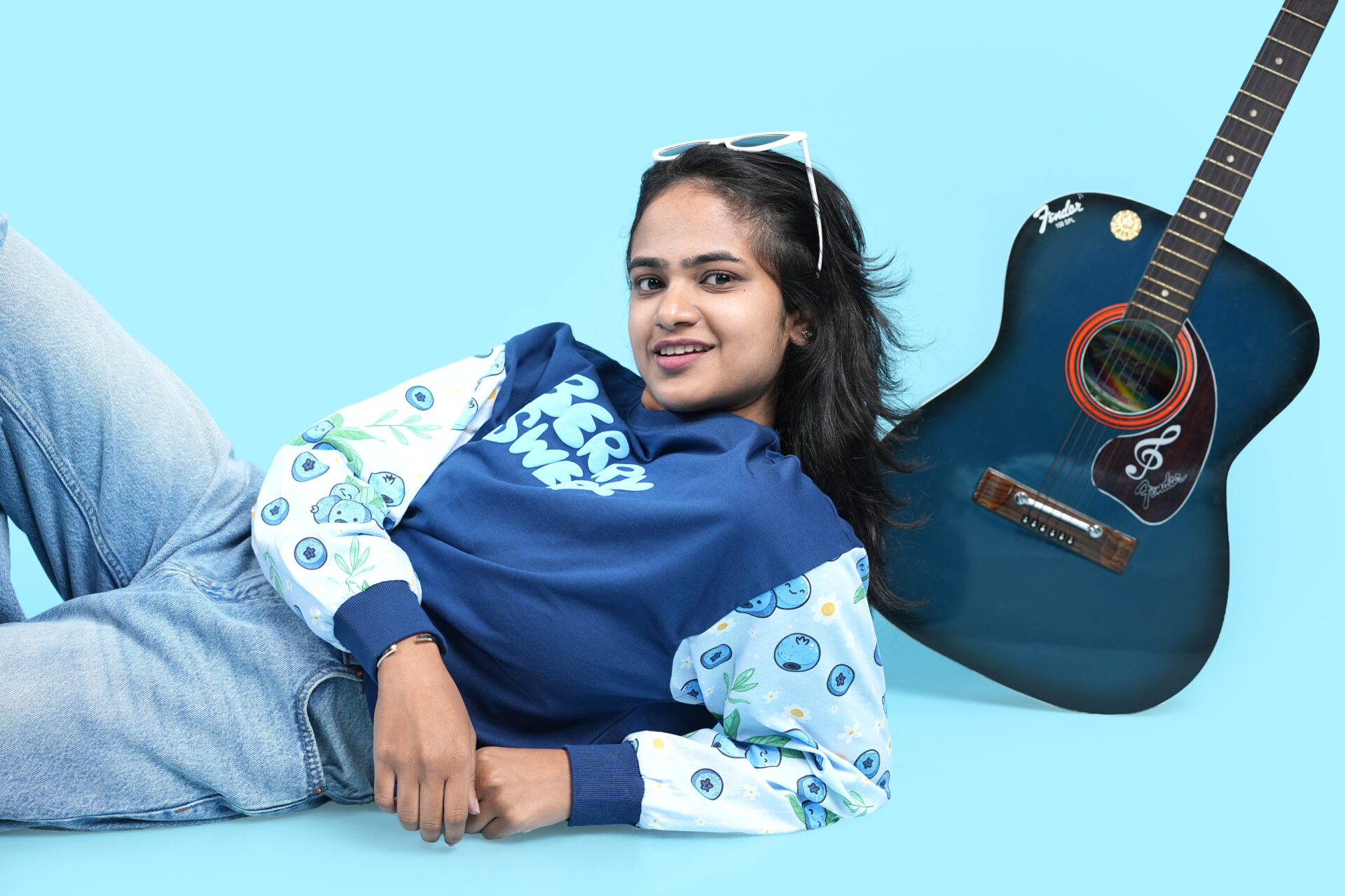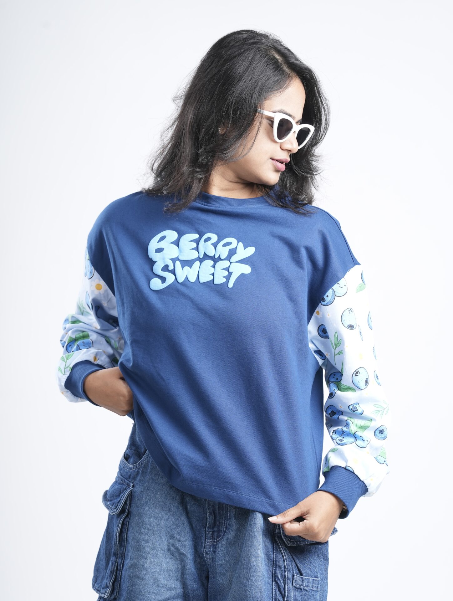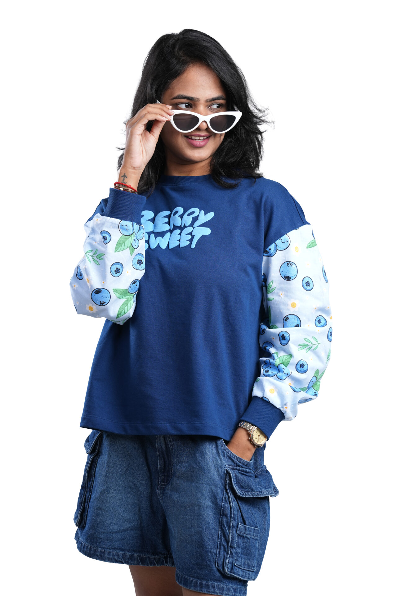 The Berry Sweet Blueberry Sweatshirt blends playful prints with everyday comfort. Featuring a soft solid body paired with blueberry-printed sleeves and a subtle “Berry Sweet” text, this piece adds just the right amount of fun to your casual wardrobe.